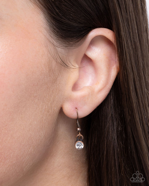 Pressed in thin, curly copper infinity-like frames, solitaire peach teardrop gems gradually increase in size below the neckline from a copper classic chain. A collection of dainty white rhinestones are sprinkled throughout each infinity frame except the two framing the centermost pendant for additional glitz and glamor. Features an adjustable clasp closure.