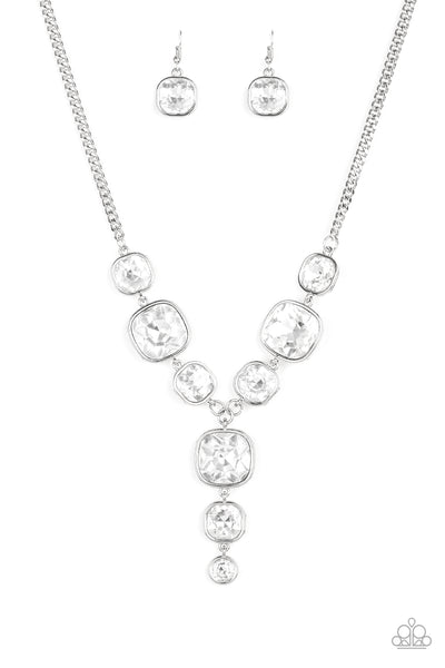 Featuring sleek silver frames, a dramatic collection of white gems cascade from the bottom thick silver chain. Additional gems trickle from the center, creating a glamorous extended pendant below the collar. Features an adjustable clasp closure.