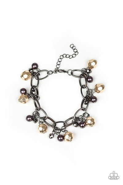Varying in size, a collection of faceted gold and pearly gunmetal beads swings from a bold gunmetal chain, creating a whimsical metallic fringe around the wrist. Features an adjustable clasp closure.