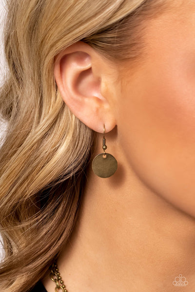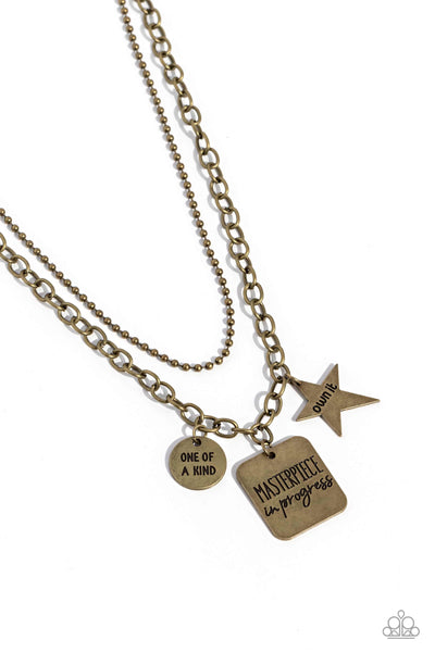 Featuring three inspirational pendants, a brass star, circle, and square fall along a brass chain. The star features the phrase "own it," the circle features the phrase "one of a kind," and the square pendant features the phrase "masterpiece in progress." Hanging just above the inspiring collection, a brass ball chain creates an additional layer to the monochromatic design. Features an adjustable clasp closure.