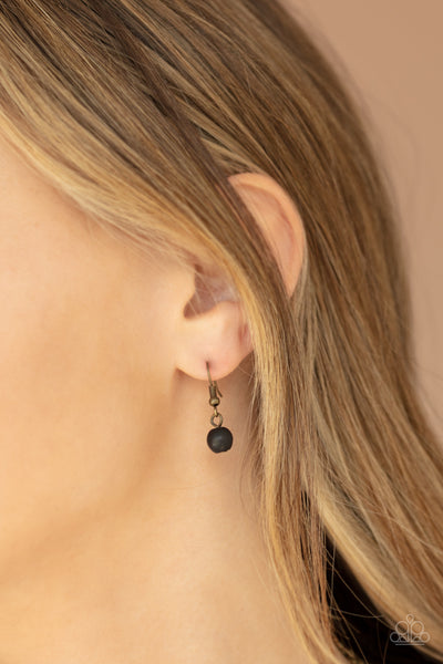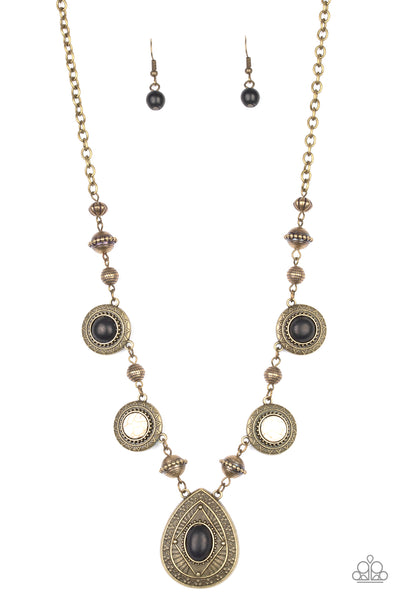 Dotted with round black and white stones, brass sunburst pattern frames join dainty brass accents along an antiqued brass chain below the collar. Embossed and studded in tribal inspired textures and dotted in a black stone, a brass teardrop pendant swings from the center for a whimsical finish. Features an adjustable clasp closure.