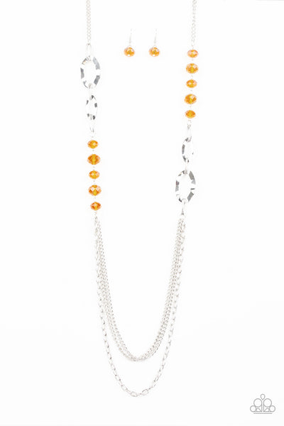 A collection of brown crystal-like beads and hammered silver frames give way to layers of mismatched silver chains for a modern look. Features an adjustable clasp closure.
