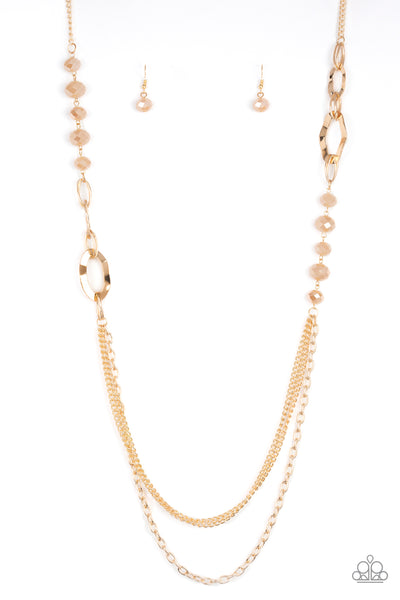 Dipped in metallic shimmer, a collection of golden crystal-like beads and hammered gold frames give way to layers of mismatched gold chains for a modern look. Features an adjustable clasp closure.