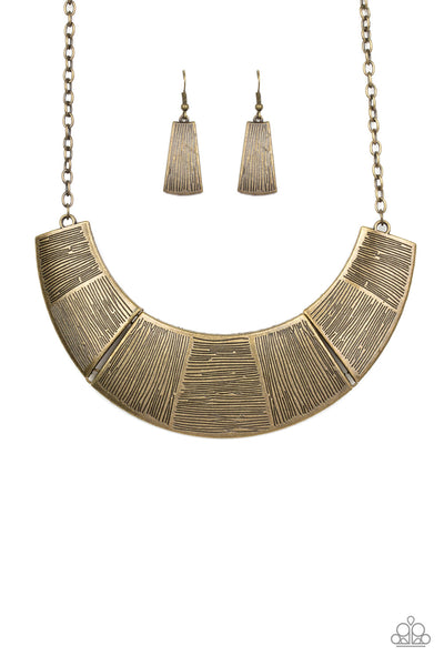 Etched in sections of vertical and horizontal linear textures, glistening antiqued brass plates link together, forming a bold half-moon pendant below the collar. Features an adjustable clasp closure.