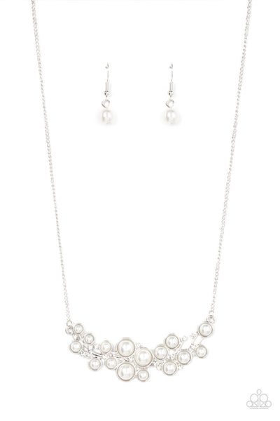 A bubbly explosion of white pearls and glassy white rhinestones delicately coalesces into an effervescent collared pendant between two dainty silver chains. Features an adjustable clasp closure.
