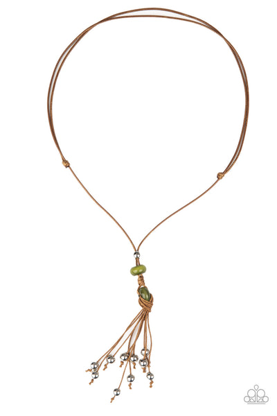 Infused with silver beaded tassels, shiny brown cording knots around glassy green beads at the bottom of a lengthened brown cord for a whimsical look. Features an adjustable sliding knot closure.