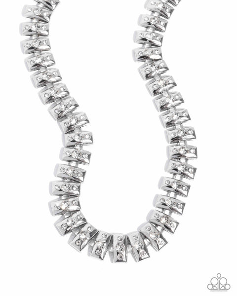 Embellished in dainty white rhinestones seemingly endless curved silver plates are threaded along the neckline for a lavishly layered display. Solitaire larger white gems dot along the center of the silver plates between the rhinestones for additional shimmer. Features an adjustable clasp closure.