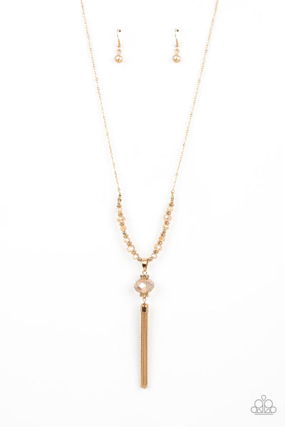 Faceted clear beads brushed in a gold coating alternate with tiny gold accents as they are threaded along a wire at the bottom of a long gold chain. An oversized golden crystal sphere, secured between rhinestone-encrusted gold rings, slides along the row of variegated beading, as a tassel of gold chains streams below in a flirtatious finish. Features an adjustable clasp closure.