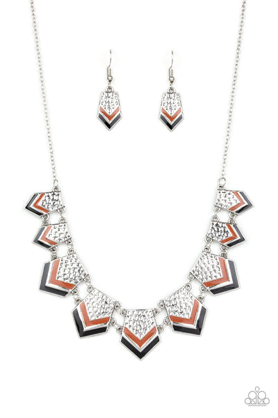 Painted in shiny black and brown accents, a collection of hammered geometric plates gradually increase in size as they fan out below the collar for a fierce tribal look. Features an adjustable clasp closure.
