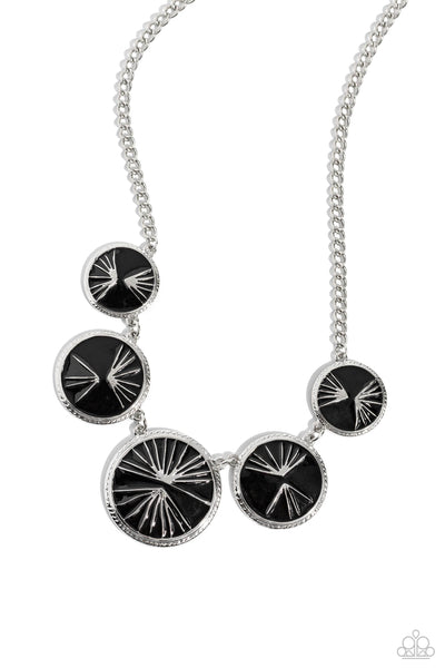 Embossed in shimmery silver palm leaf patterns, round black frames link below the collar for a summer-inspired look. Each black-painted frame is encircled in silver rope-like texture for an industrial finish. Features an adjustable clasp closure.