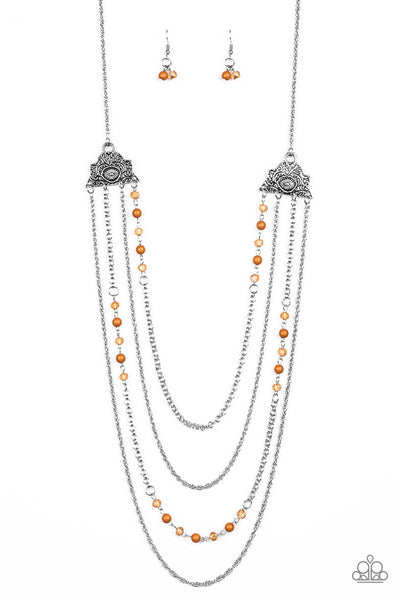 Attached to two ornate floral silver fittings, shimmery silver chains and strands of polished brown and glassy crystal-like beads cascade across the chest for a whimsically layered look. Features an adjustable clasp closure.