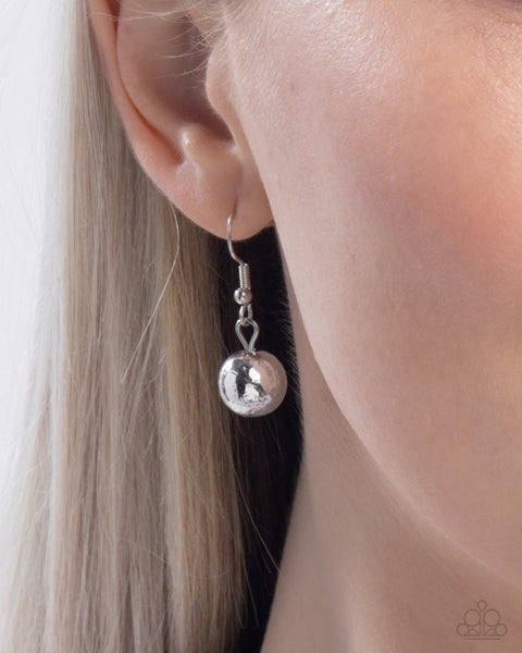 A collection of oversized, hammered silver beads is threaded along strands of gray cords, creating a bold and industrial design. The contrasting textures and finishes bring a modern flair to this striking necklace. Features an adjustable clasp closure.