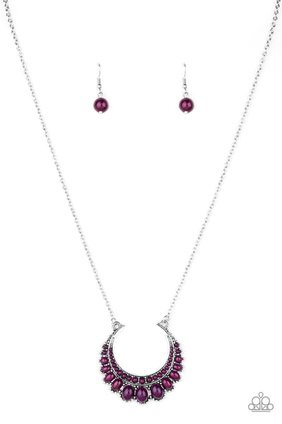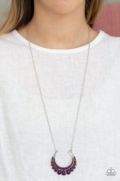 Gradually increasing in size towards the center, dainty purple beads are encrusted along the center of a silver crescent frame. Purple beads flare out from the bottom of the shimmery silver frame, creating a bold stationary pendant at the bottom of an elongated silver chain. Features an adjustable clasp closure.