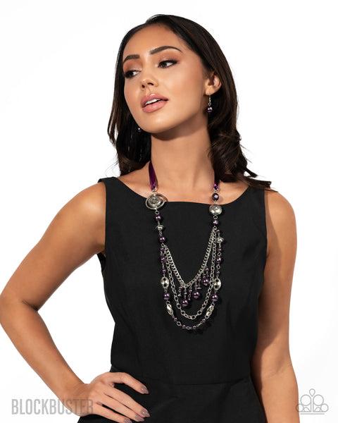 Replacing a traditional chain, a knotted, silky purple ribbon gives way to textured silver discs, deep purple classic and baroque pearls, rope-textured silver beads, silver tabs, silver cable chain strands, and chunky silver curb chain strands that cascade, intermix, and layer below the neckline for an opulent one-of-a-kind look.