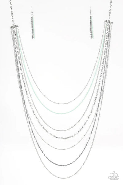 Mismatched silver chains alternate with dainty gray and green chains down the chest, creating a colorful industrial look. Features an adjustable clasp closure.