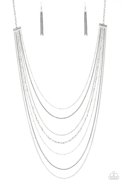 Mismatched silver chains alternate with dainty gray chains down the chest, creating a colorful industrial look. Features an adjustable clasp closure.