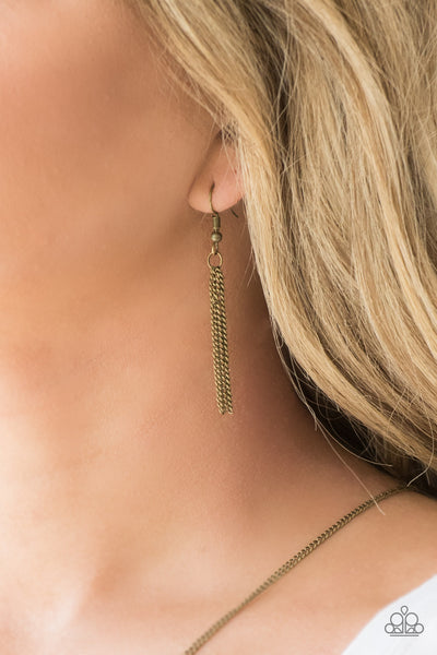 Four brass hexagon frames connect at the bottom of a lengthened brass chain, creating an edgy stacked pendant. A glistening brass tassel swings from the bottom of the geometric pendant, adding movement to the modern piece. Features an adjustable clasp closure.