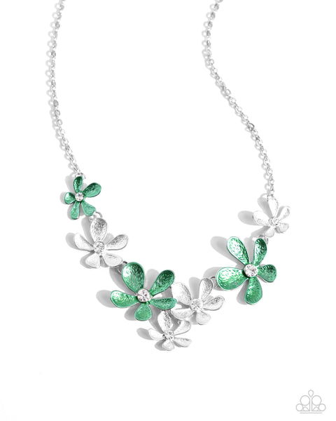 Rounded textured Mint and silver florals in varying sizes with white rhinestone centers connect to a silver cable chain, coalescing below the neckline for a beautiful bouquet. Features an adjustable clasp closure.