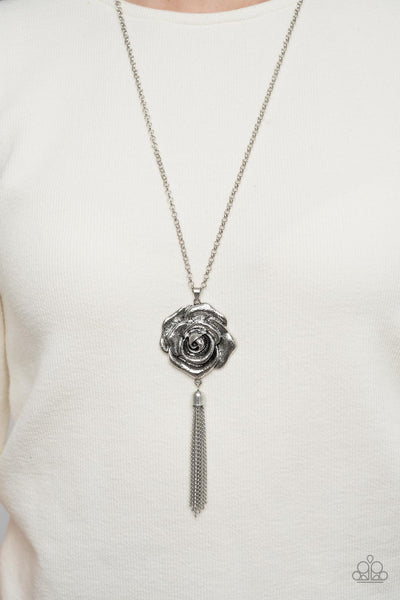 A rustic silver chain tassel dances from the bottom of an oversized silver rosebud frame, resulting in a vintage inspired pendant at the bottom of an extended silver chain. Features an adjustable clasp closure.