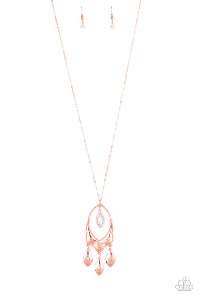 Encrusted in a ring of glassy white rhinestones, an iridescent marquise shaped rhinestone swings from the top of an ornate shiny copper frame dotted in white rhinestone flowers. Dotted with matching white rhinestones, shiny copper frames dangle from the bottom of the frame at the bottom of a lengthened shiny copper chain for a trendsetting finish. Features an adjustable clasp closure.