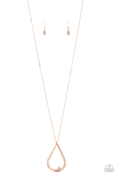 Dainty white rhinestones collect at the bottom of a triple stacked shiny copper teardrop, creating an elegantly refined pendant at the bottom of a lengthened shiny copper chain. Features an adjustable clasp closure.
