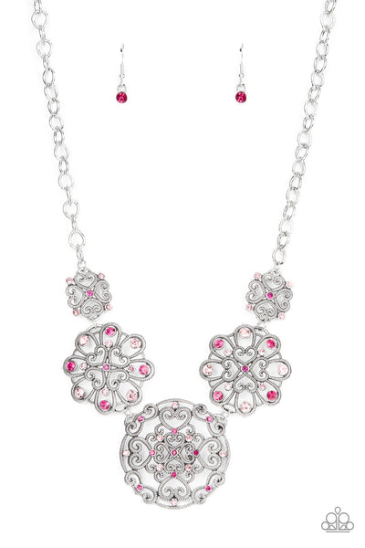 Spiraling with heart shaped filigree patterns, a mismatched collection of silver mandala-like frames delicately link below the collar. A smattering of dark and light pink rhinestones adorn the ornate frames, adding a spritz of glitter to the regal display. Features an adjustable clasp closure.