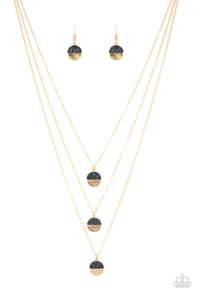 Featuring earthy black stone accents, a trio of gold discs layer down the chest for a seasonal look. Features an adjustable clasp closure.