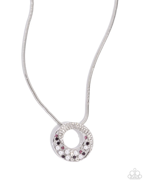 Glittering from a silver snake chain, an airy silver pendant swirls with dainty white, amethyst, and light amethyst rhinestones, gems, and white pearls in a haphazard, scattered pattern for the ultimate blinged-out statement. Features an adjustable clasp closure.