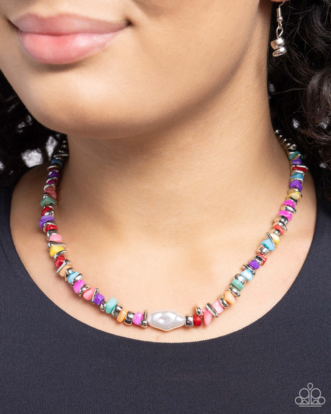 Featuring a reflective sheen, chiseled multicolored stones and silver beads alternate along the neckline for a seasonal statement. A baroque white pearl is infused along the center of the design for additional attention-grabbing detail. Features an adjustable clasp closure. As the stone elements in this piece are natural, some color variation is normal.
