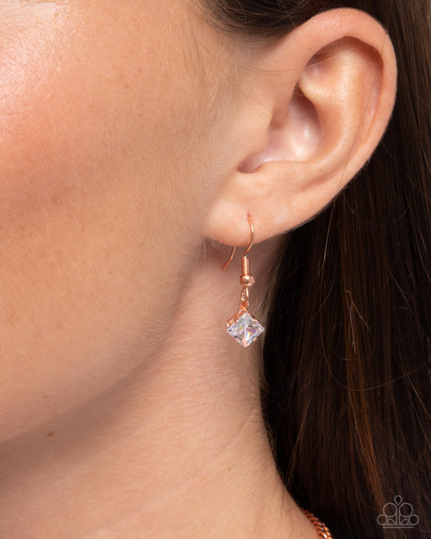 Pressed in elevated shiny copper fittings, faceted white square gems are sporadically sprinkled along a shiny copper curb chain, gradually increasing in size along the center of the neckline, adding a dramatic, dauntless flash of glitz. Features an adjustable clasp closure.