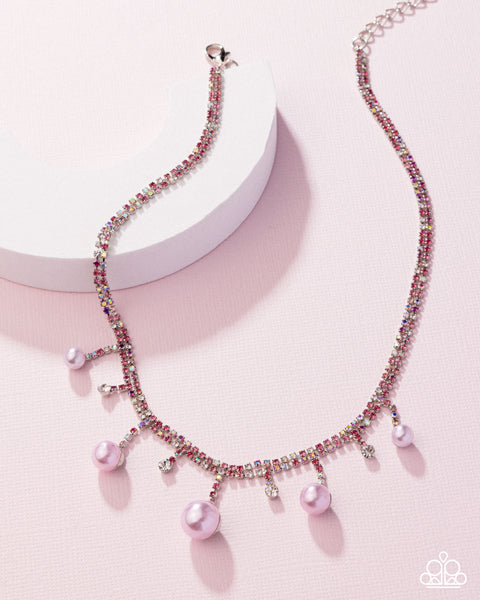 A doubled strand of various dainty pink multicolored and pink iridescent rhinestones in dainty square fittings coalesce around the collar. Faceted white gems alternate with baby pink pearls in varying sizes as they drip from the dazzling row above from additional strands of pink multicolored rhinestones in square fittings for a ritzy finish. Features an adjustable clasp closure. Due to its prismatic palette, color may vary.