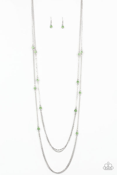 Dotted with glittery green rhinestones, two glistening silver chains give way to layers of dainty silver chains for a refined look. Features an adjustable clasp closure.