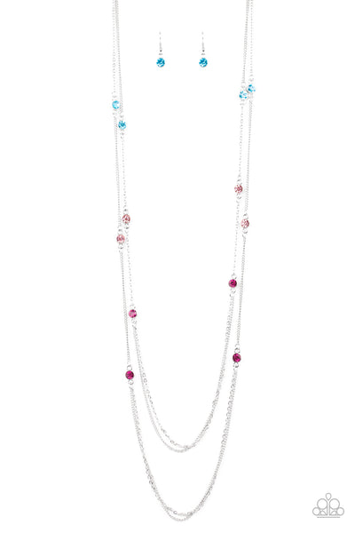 Dotted with a collection of glittery multicolored rhinestones, two glistening silver chains give way to layers of dainty silver chain for a refined look. Features an adjustable clasp closure.