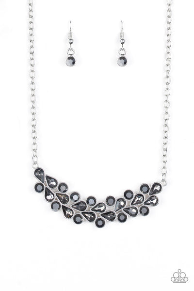 A collection of round and teardrop hematite and smoky rhinestones coalesce into a bowing silver pendant below the collar for a refined look. Features an adjustable clasp closure.