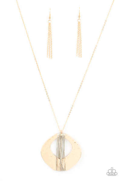 Dainty silver wire is haphazardly wrapped around the center of a hammered oval gold frame, creating a one-of-a-kind pendant at the bottom of a lengthened gold chain. Features an adjustable clasp closure.