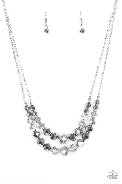 Faceted hematite and smoky crystal-like gems are threaded along invisible wires, creating gorgeous layers beneath the collar. The glittery gems gradually increase in size near the center for a dramatic finish. Features an adjustable clasp closure.