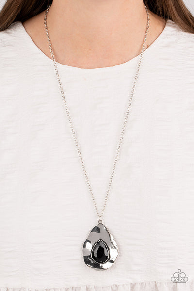 A warped silver frame gently folds around an oversized black teardrop gem center, resulting in a gritty yet glamorous pendant at the bottom of a lengthened silver chain. Features an adjustable clasp closure.