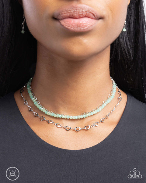 Layers of delicate silver chains featuring dainty heart-shaped links drape along the neck. A row of translucent faceted green beads brings a subtle pop of color to the layered design. Features an adjustable clasp closure.