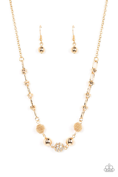 Pairs of gold coiled and smooth gold beads flank a white rhinestone encrusted bead along an oval and gold disc linked chain, creating a glitzy combination below the collar. Features an adjustable clasp closure.