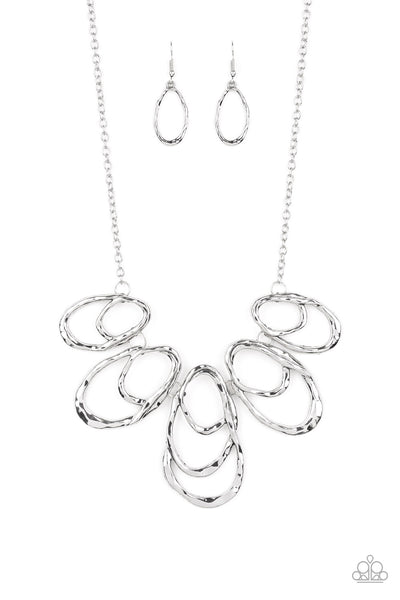 Delicately hammered silver bars overlap into a collection of asymmetrical teardrops below the collar, creating a bold artisan inspired fringe. Features an adjustable clasp closure.