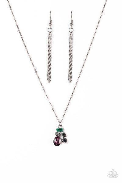 Varying in shape and size, glittery multicolored rhinestones and hematite rhinestones coalesce into a sparkling pendant below the collar for a timeless look. Features an adjustable clasp closure.