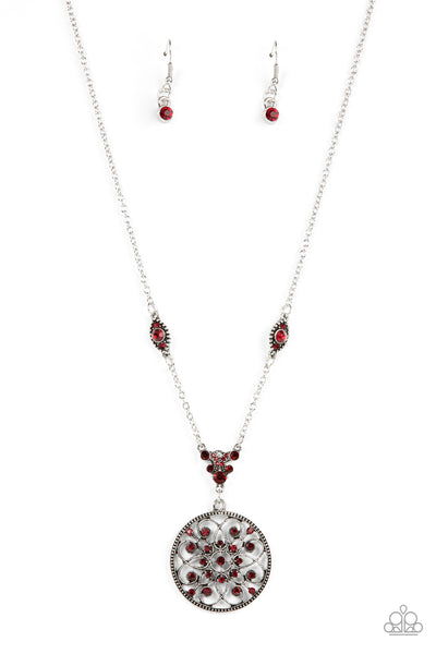 Glittery red rhinestones are sprinkled across a silver floral frame, creating a timeless pendant at the bottom of a dainty silver chain that has been enhanced with matching red rhinestone embellished frames. Features an adjustable clasp closure.