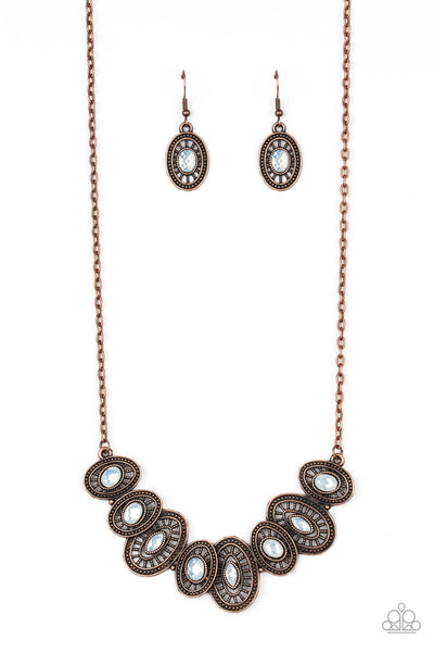 Featuring iridescent rhinestone centers, a whimsical collection of ornate copper oval frames delicately overlap into a bowing pendant below the collar. Features an adjustable clasp closure.