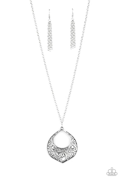 Brushed in an antiqued finish, studded silver vine-like filigree collects inside an abstract teardrop frame at the bottom of a lengthened silver chain for a whimsically rustic look. Features an adjustable clasp closure.