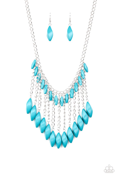 A row of faceted blue beads swing from the bottom of a shimmery silver chain below the collar. Larger blue beads cascade from the bottoms of free-falling silver chains, creating a vivacious fringe. Features an adjustable clasp closure.