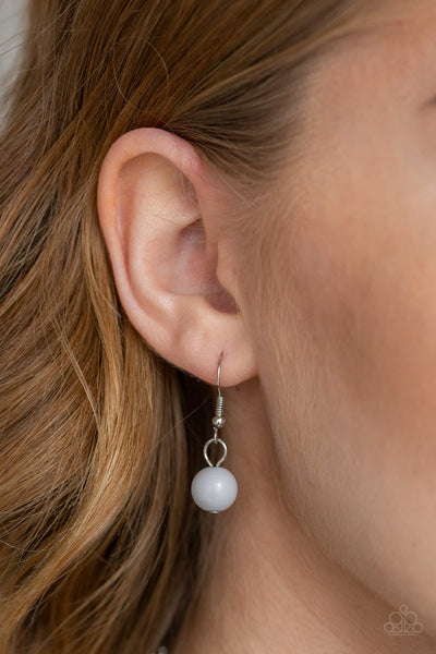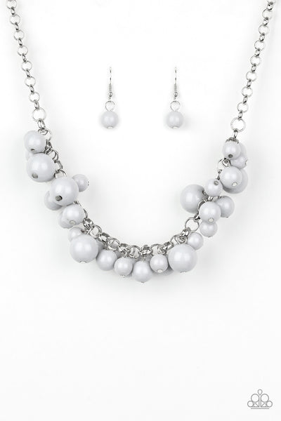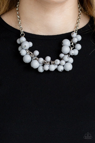 A collection of bubbly gray beads swing from the bottom of a shimmery silver chain, creating a vivacious fringe below the collar. Features an adjustable clasp closure.