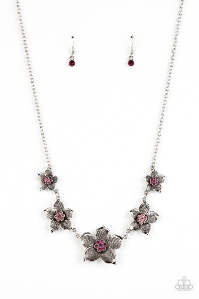 A charming collection of antiqued silver flowers in diminishing sizes delicately link across the collar. The detailed petals are etched in antiqued silver and fan out from lovely pink rhinestone centers resulting in a blissful enchantment. Features an adjustable clasp closure.