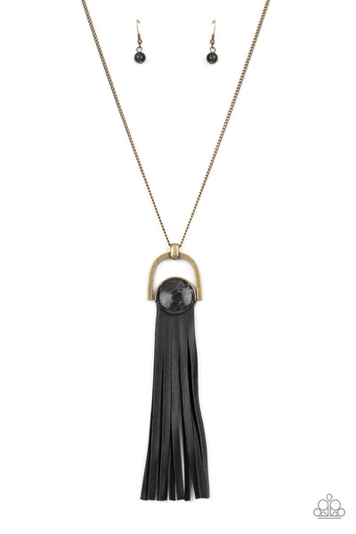 Strips of black leather fan out from the bottom of a round black stone that is threaded along a metal rod that attaches to the bottom of a brass horseshoe frame. The earthy pendant swings from the bottom of an extended brass chain, resulting in a wildly wonderful tassel. Features an adjustable clasp closure.