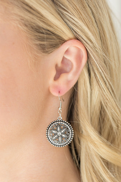 Dotted with glittery white rhinestone centers, floral silver frames gradually increase in size as they link below the collar for a whimsical look. Features an adjustable clasp closure.