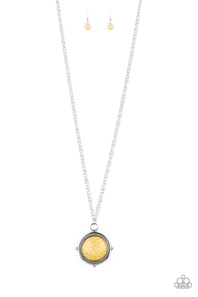 A smooth yellow stone is pressed into a shimmery silver frame radiating with metallic rope-like texture, creating a bold pendant at the bottom of a lengthened silver chain. Features an adjustable clasp closure.